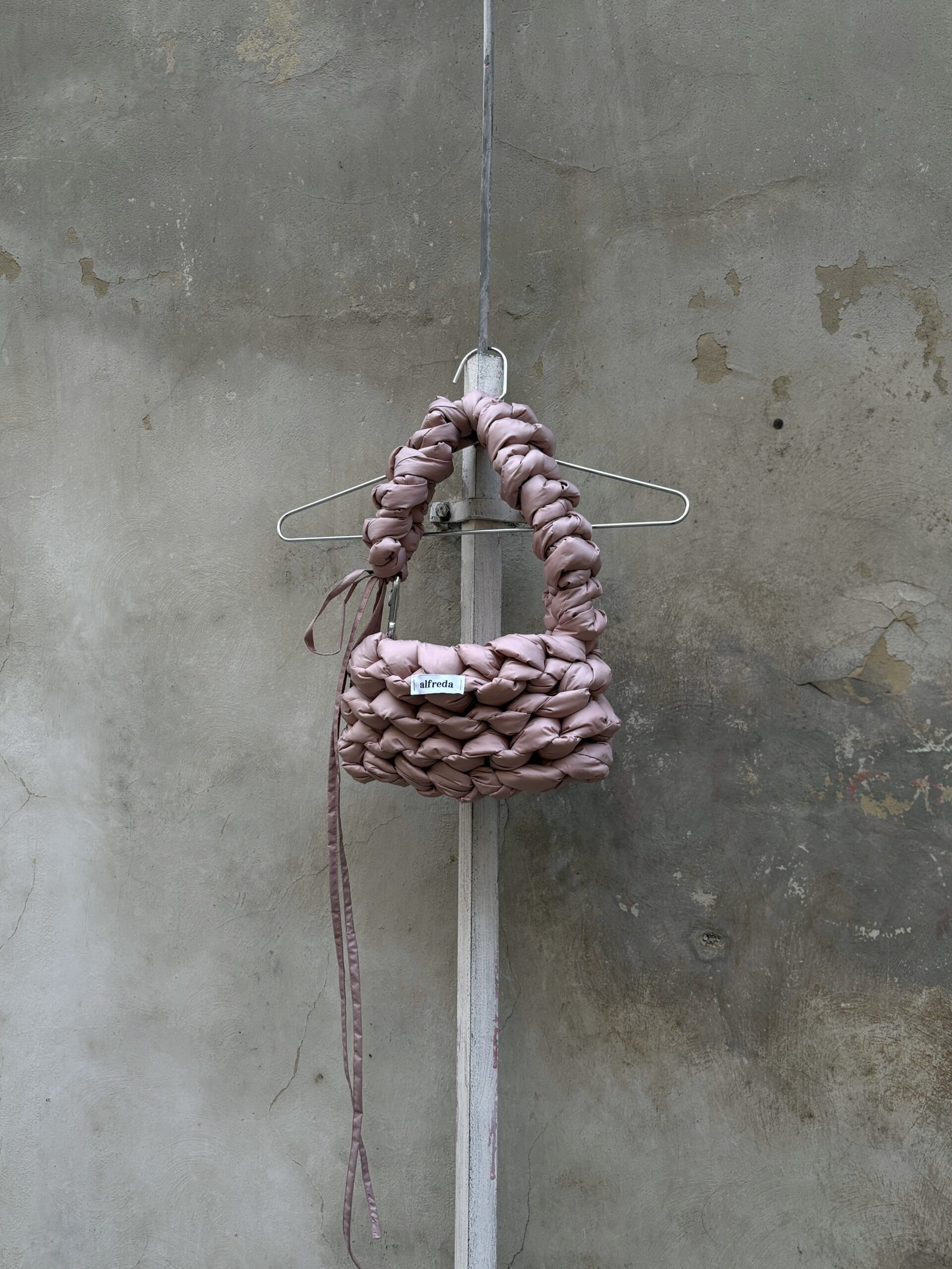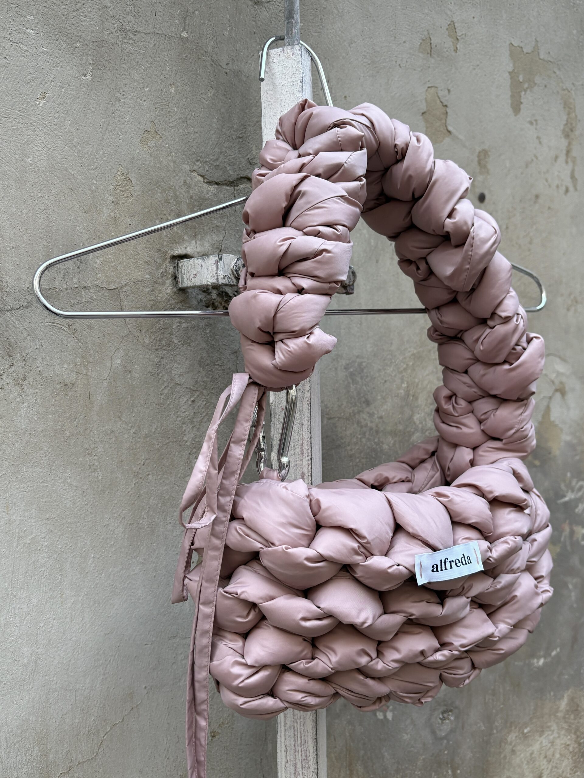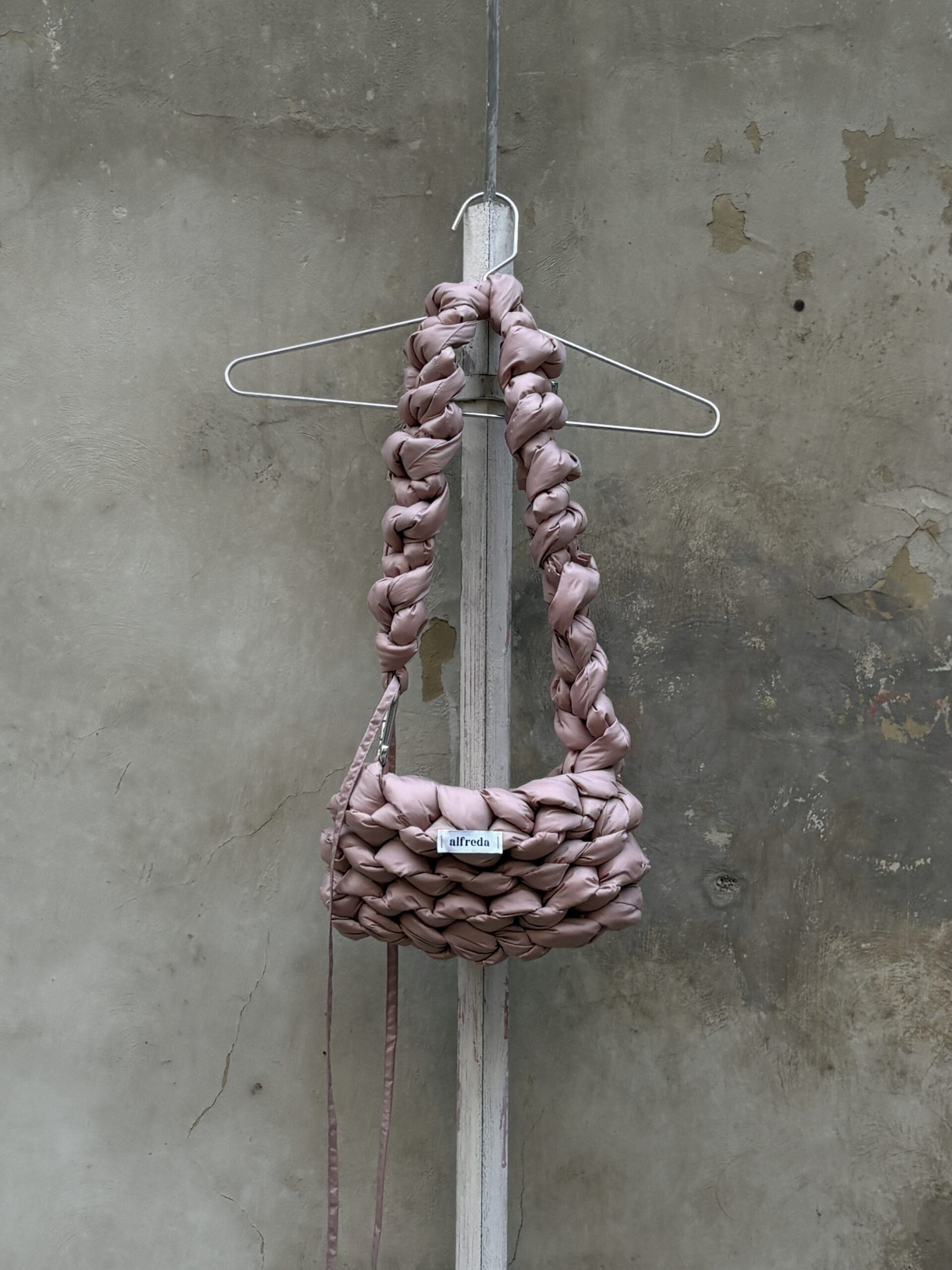 Každý kus je zcela ručně vyrobený, od stříhání látky až po poslední steh – látka a výplňový materiál jsou stříhány do obdélníkových tvarů, a vzniká tak dlouhý pruh, z něhož se kabelka háčkuje.