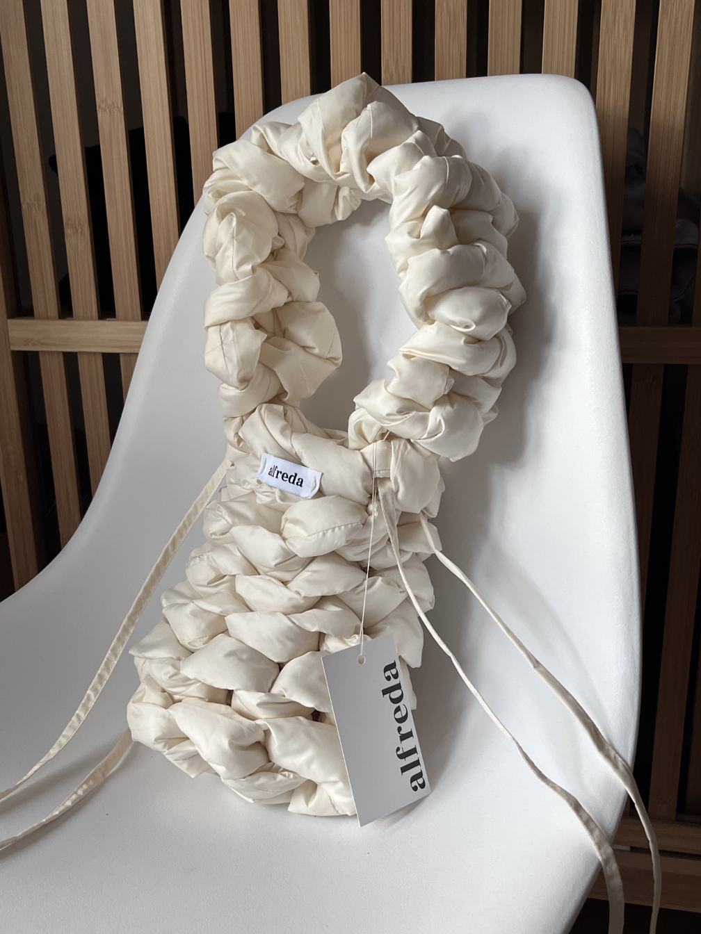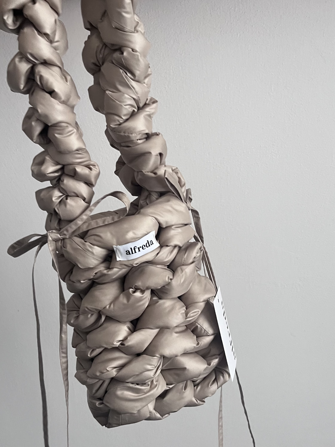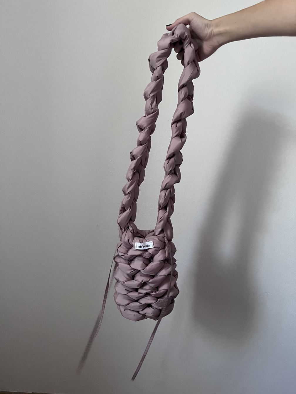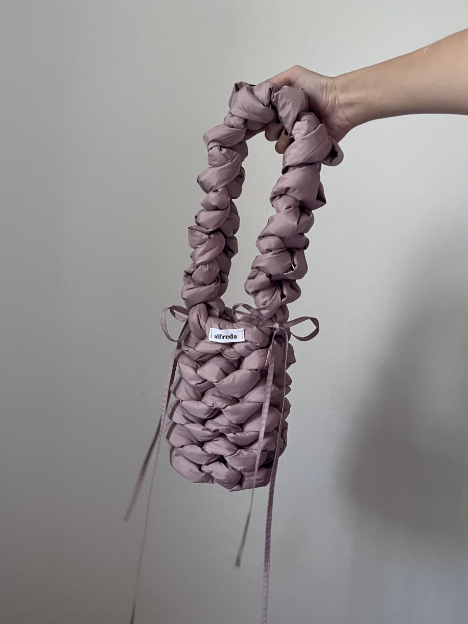 Každý kus je zcela ručně vyrobený, od stříhání látky až po poslední steh – látka a výplňový materiál jsou stříhány do obdélníkových tvarů, a vzniká tak dlouhý pruh, z něhož se kabelka háčkuje.